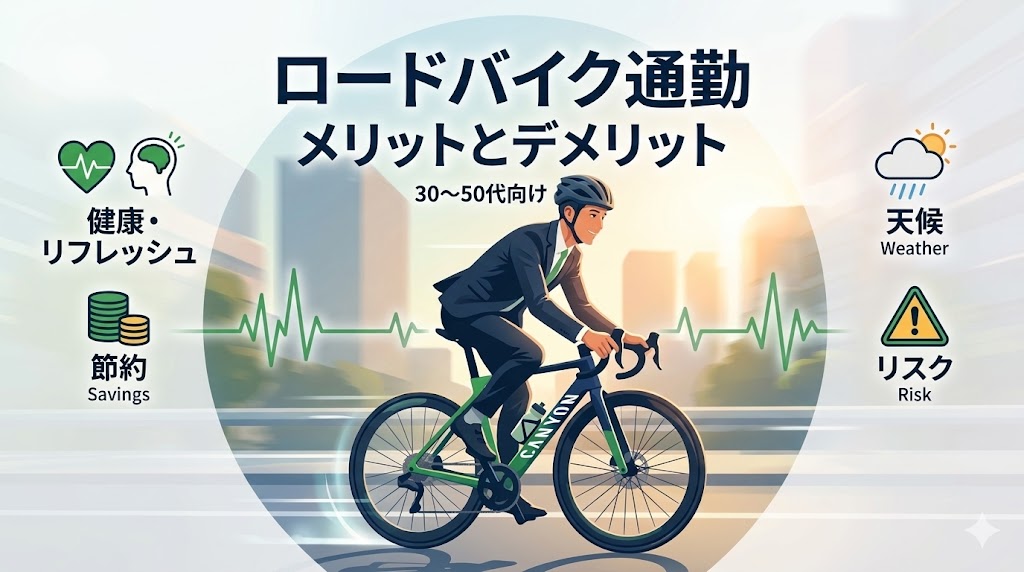 ロードバイク通勤のメリットとデメリットを徹底解説。健康効果・交通費節約・ストレス解消などの利点から事故リスクや雨対策まで網羅。30〜50代の初心者向けに始め方や体の不調対策も詳しく紹介します。